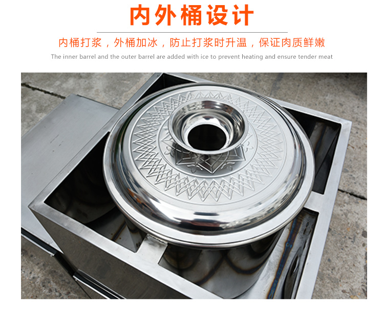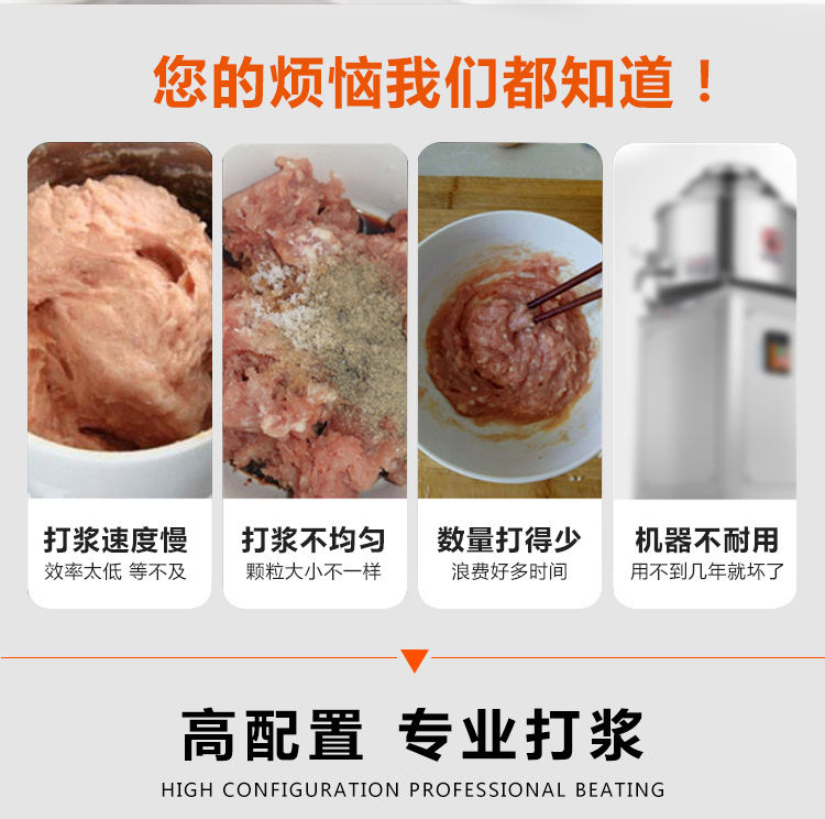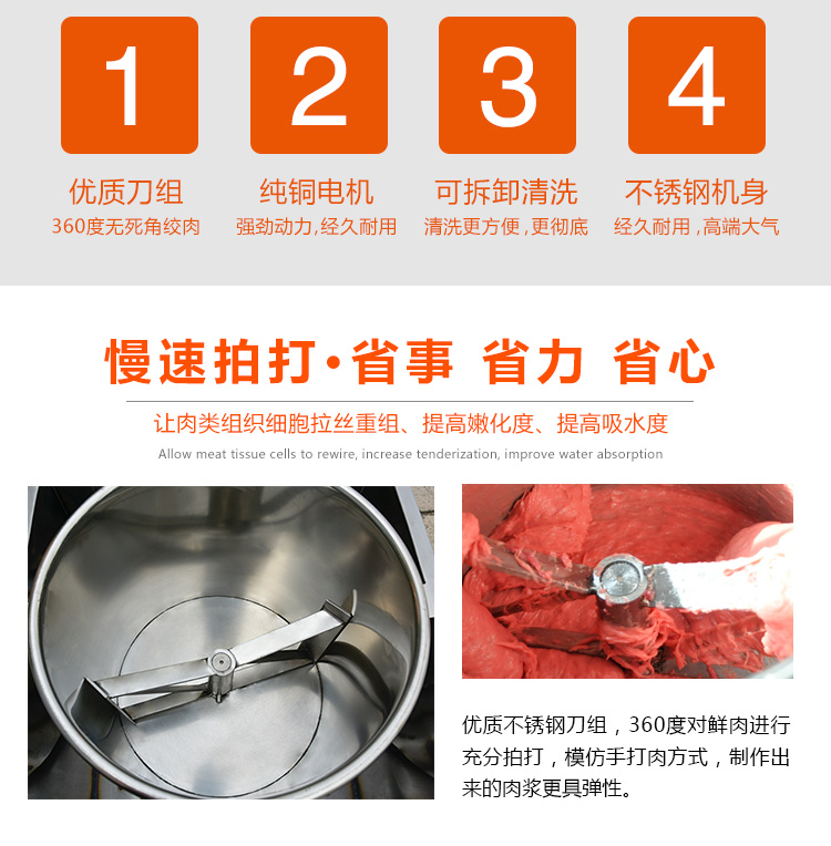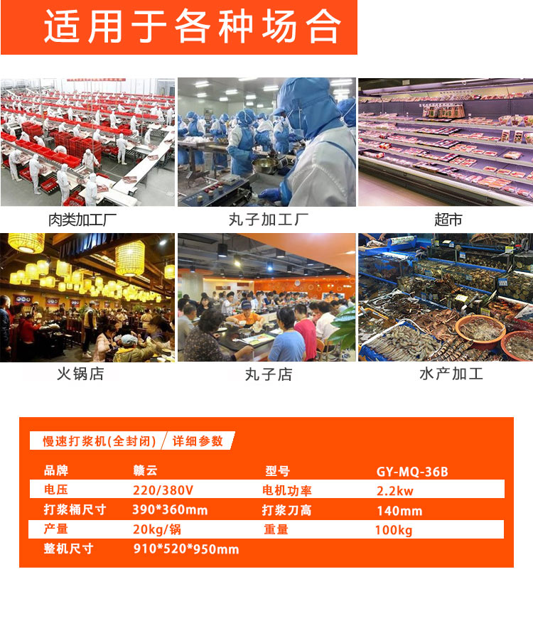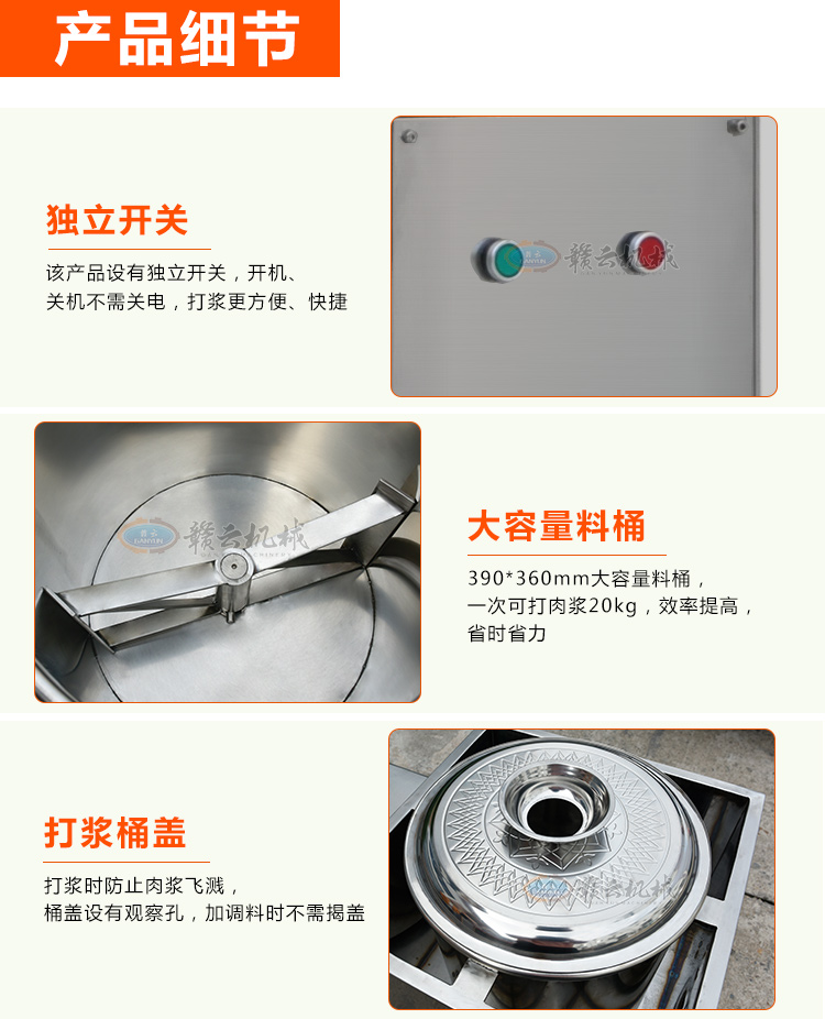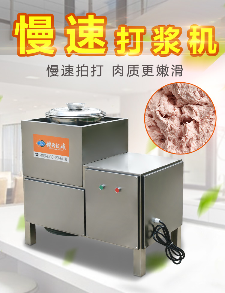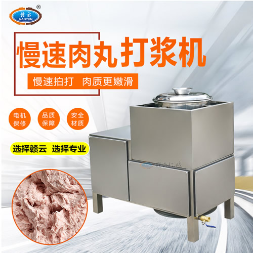 贛云牌36型全封閉式慢速肉丸打漿機選優(yōu)質(zhì)不銹鋼,在全不銹鋼慢速肉丸打漿機基礎(chǔ)上將整機外殼用不銹鋼板材封裝,更好的保護電動機,通過小皮帶輪帶動大皮帶輪減速,慢速拍打肉漿。