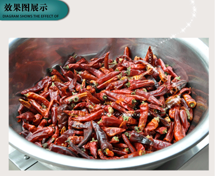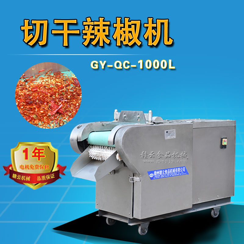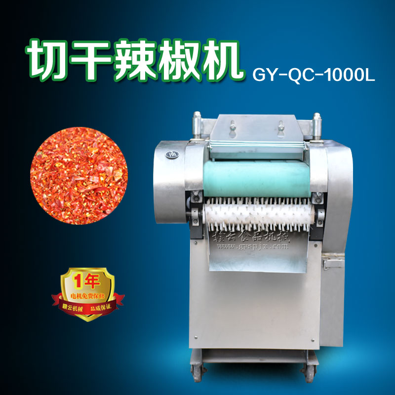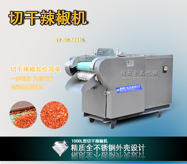 本機器是在1000型切菜機的基礎上針對干辣椒特性而改進的。改壓菜帶為滾軸壓制,為使干辣椒能比較有序的進入豎刀之中,對輸送帶入口增加隔板隔離輸送。