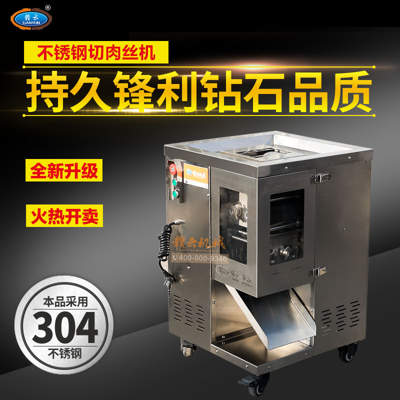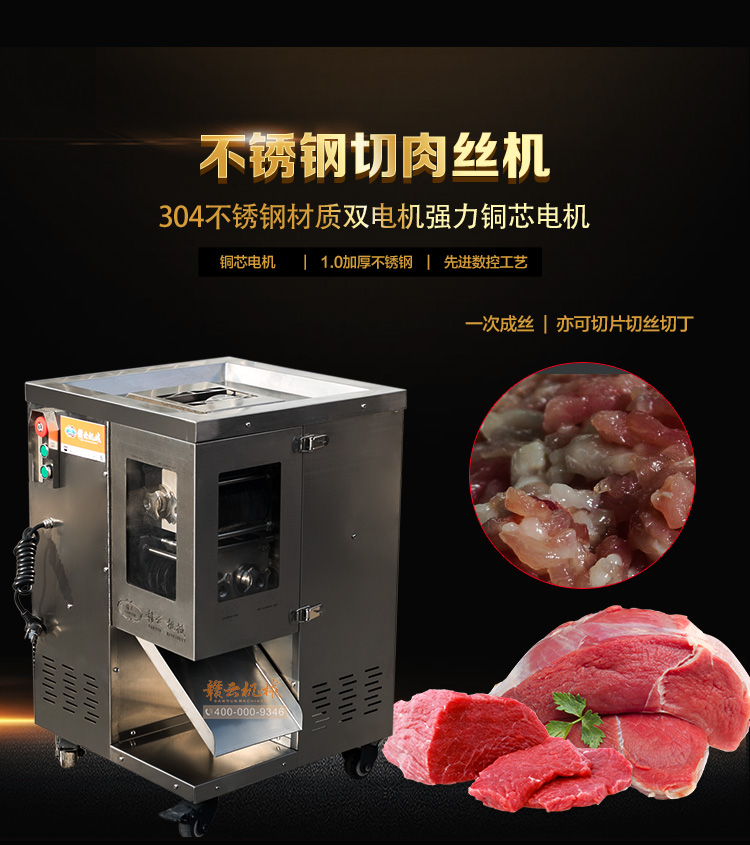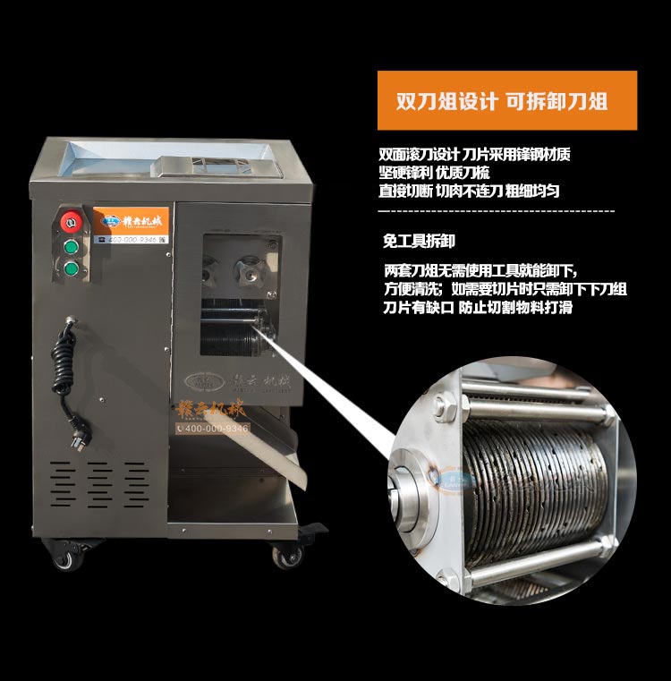 整機采用304不銹鋼板材封裝設(shè)計,板材標(biāo)準(zhǔn)1mm厚,刀片采用特質(zhì)材質(zhì)雙滾切刀,鋒利耐用,雙電機分別控制垂直刀組切割肉類,可一次成絲,可免工具拆卸清洗刀組,切肉速度快,力度強,切絲規(guī)格均勻