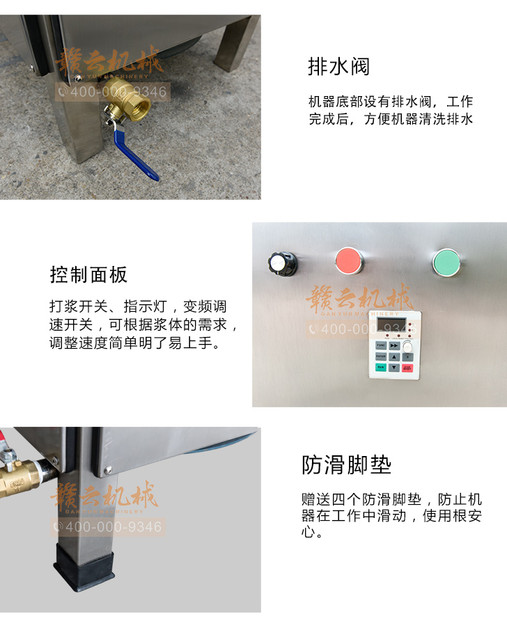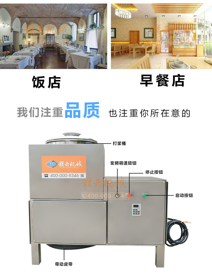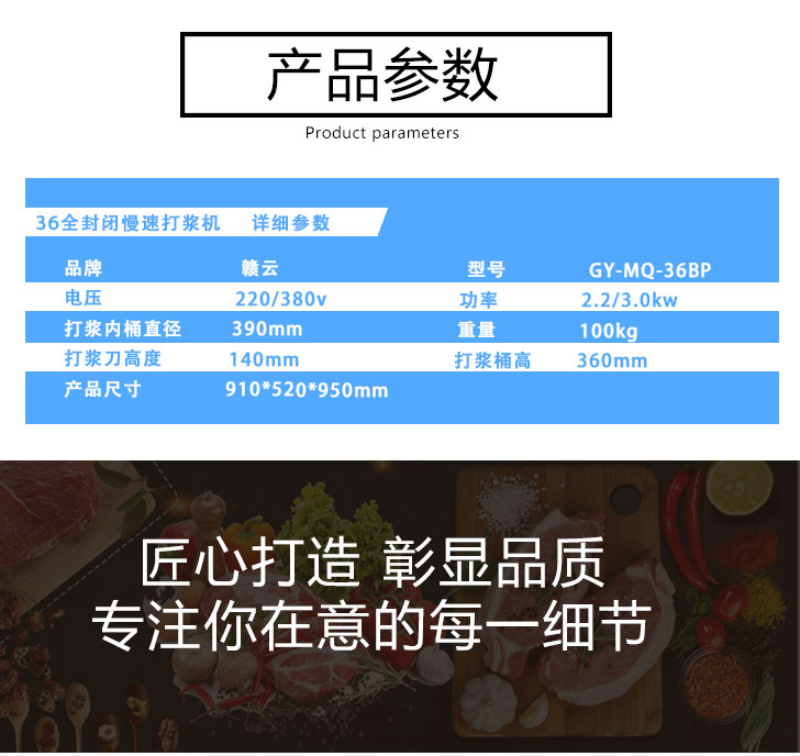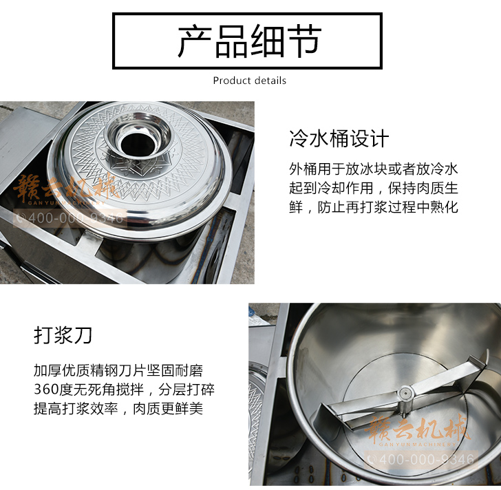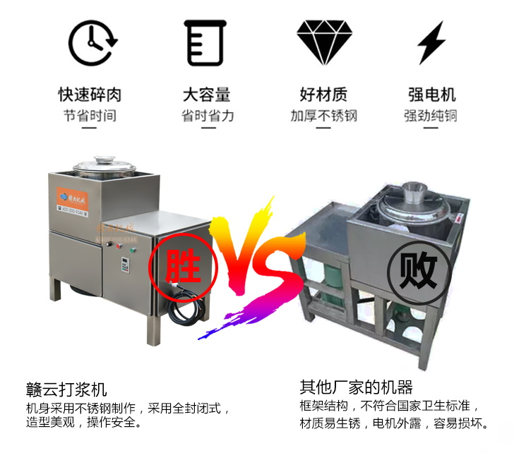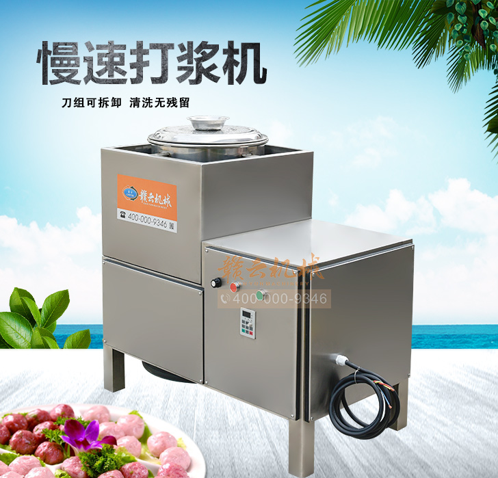 贛云牌36型全封閉式慢速變頻肉丸打漿機選優(yōu)質(zhì)不銹鋼,在全不銹鋼慢速肉丸打漿機基礎(chǔ)上將整機外殼用不銹鋼板材封裝,更好的保護電動機,通過小皮帶輪帶動大皮帶輪減速,慢速拍打肉漿。