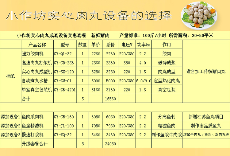 | 貢丸成套設(shè)備套餐 新鮮豬肉 產(chǎn)量標(biāo)準(zhǔn):200斤/小時(shí) 所需面積:100平米 |