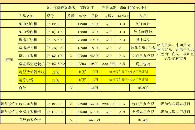 | 貢丸成套設(shè)備套餐 凍肉加工 產(chǎn)量標(biāo)準(zhǔn):500-1000斤/小時(shí) 所需面積:300平米及以上 |