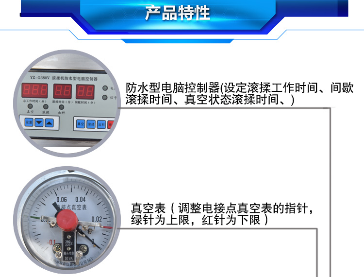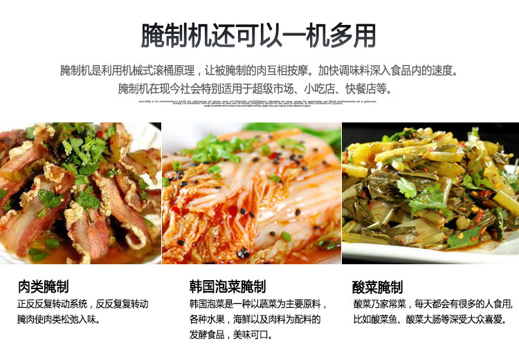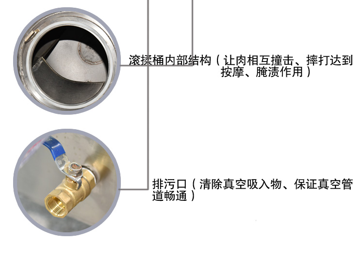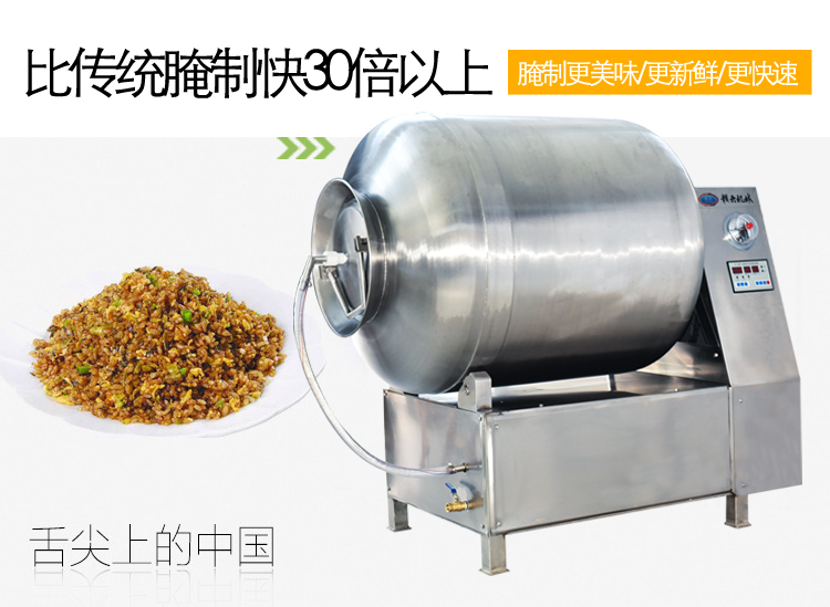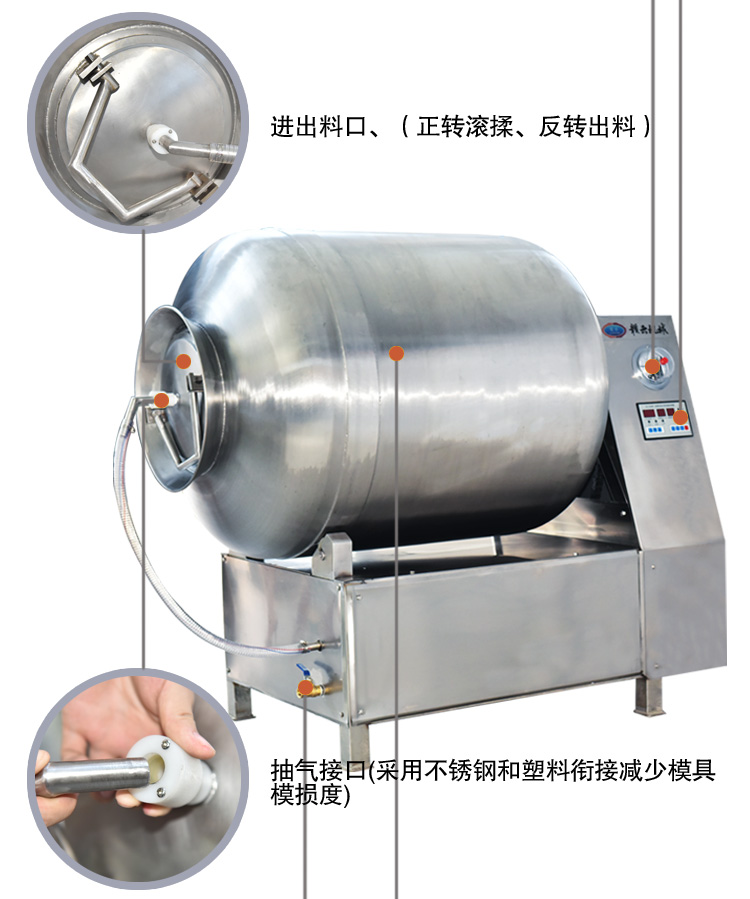 真空滾揉機可以使肉均勻的吸收腌漬,可以提高肉的結著力及產(chǎn)品的彈性;可以提高產(chǎn)品的口感及斷面效果;可以增強保水性,增加出品率;可以改善產(chǎn)品的內(nèi)部結構,節(jié)能高效。整機采用不銹鋼制造,結構緊湊,滾筒兩端均采用旋壓式封帽結構,大大的增加滾筒內(nèi)的摔打空間,使?jié)L揉產(chǎn)品的效果均勻,噪音小,性能可靠,操作簡便,使用效率更高。