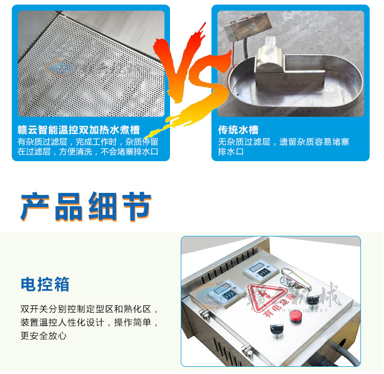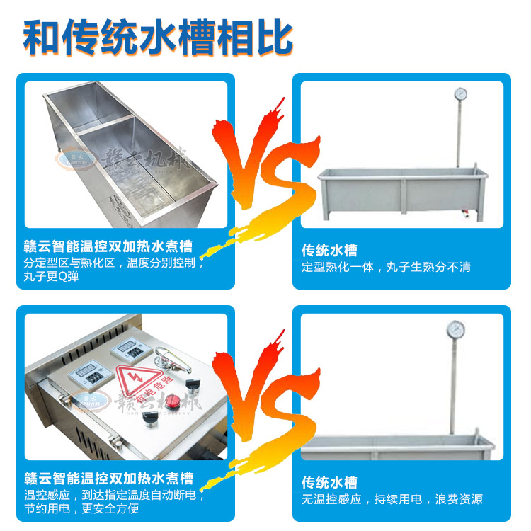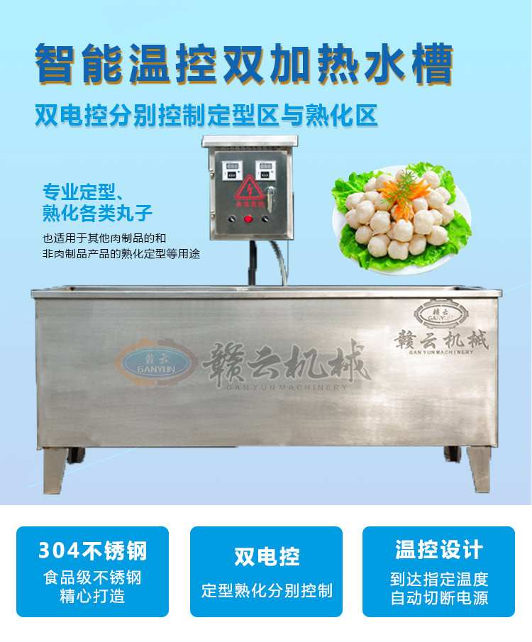 整機采用304不銹鋼板材設(shè)計,中間采用發(fā)泡劑,取保溫隔熱作用,雙槽加熱,獨立控制,定型熟化分別控制,加熱速度快,省電更省心。本產(chǎn)品量身設(shè)計可配套用于我廠生產(chǎn)的包心肉丸機、牛肉貢丸機、墨魚丸成型機、獅子頭成型機、雙調(diào)速肉丸機、火鍋丸子機組等多種肉丸成型設(shè)備使用?杉佑,用于油炸丸子的定型熟化,可加水,用于各種肉丸的定型熟化,根據(jù)其加熱作用原理,也適用于其他肉制品的和非肉制品產(chǎn)品的熟化定型等用途。