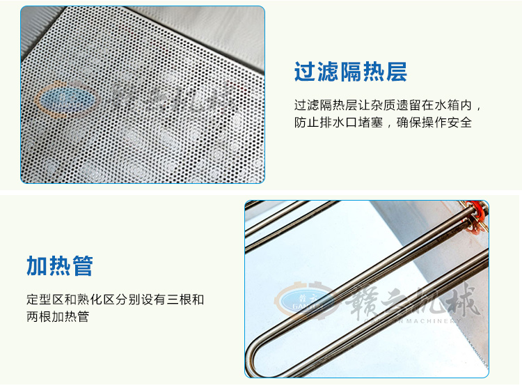 整機采用304不銹鋼板材設(shè)計,中間采用發(fā)泡劑,取保溫隔熱作用,雙槽加熱,獨立控制,定型熟化分別控制,加熱速度快,省電更省心。本產(chǎn)品量身設(shè)計可配套用于我廠生產(chǎn)的包心肉丸機、牛肉貢丸機、墨魚丸成型機、獅子頭成型機、雙調(diào)速肉丸機、火鍋丸子機組等多種肉丸成型設(shè)備使用?杉佑停糜谟驼ㄍ枳拥亩ㄐ褪旎,可加水,用于各種肉丸的定型熟化,根據(jù)其加熱作用原理,也適用于其他肉制品的和非肉制品產(chǎn)品的熟化定型等用途。
