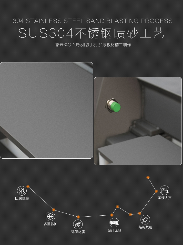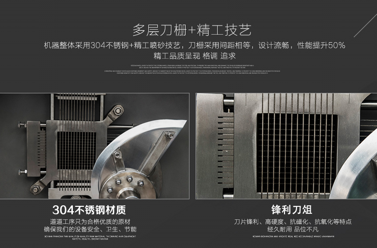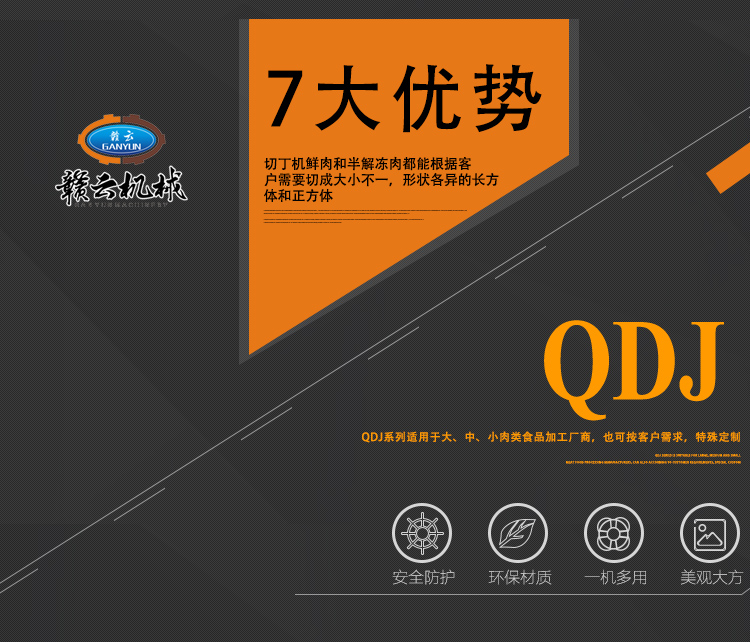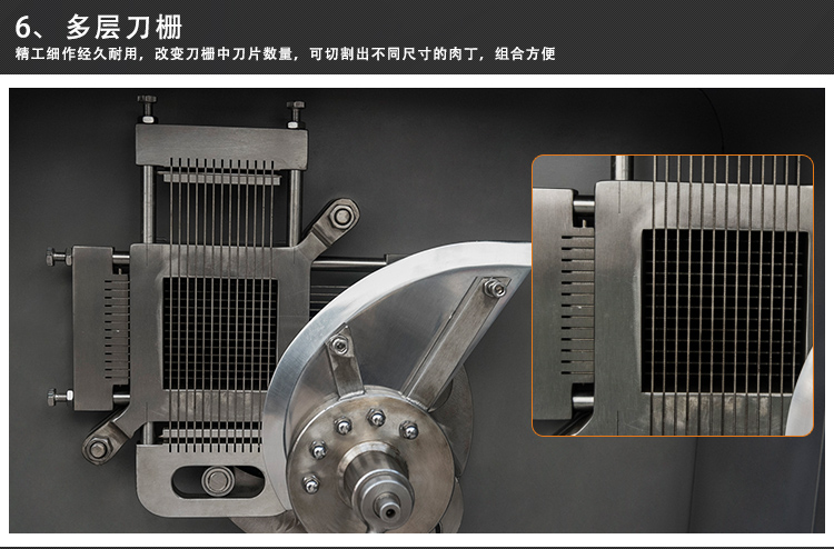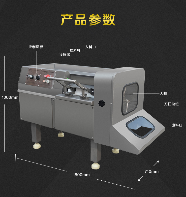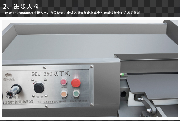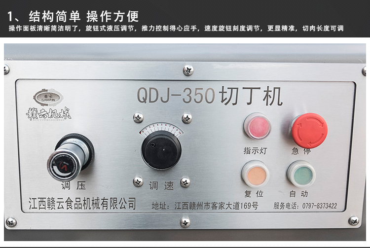 贛云350型切肉丁機,采用304不銹鋼噴砂處理技術,裝備優(yōu)質刀組,利用流水線條設計,配合激光雕刻控制面板,整體外形美觀大氣。液壓步進式推料自動切割,推料速度旋鈕可調,拆增刀片可切出多種規(guī)格肉丁、肉條、肉片。是肉類食品加工切丁專用設備。