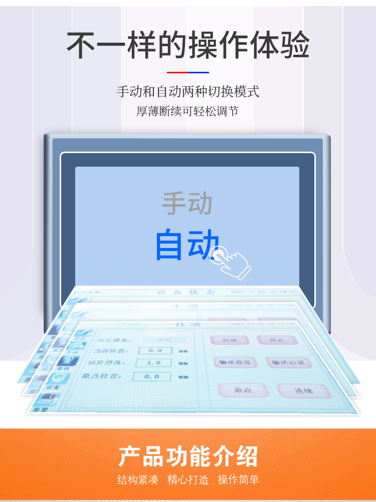 機器采用鋒利加厚鋼刀,鋒利耐用,平滑刀主要用于切熟肉和鮮肉,鋸齒刀主要用于砍凍肉和帶骨的家禽,機器默認配置平滑刀。機器采用手動和自動兩種切換模式,并且厚薄斷續(xù)可輕松調節(jié)。