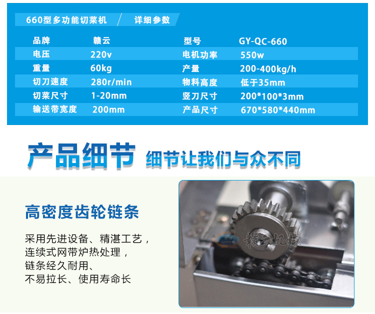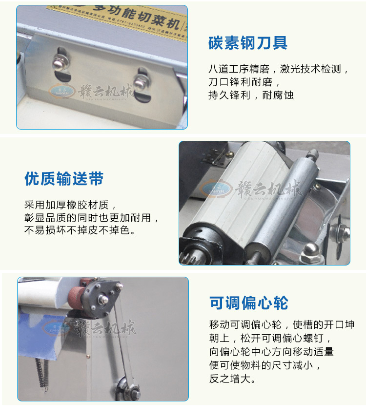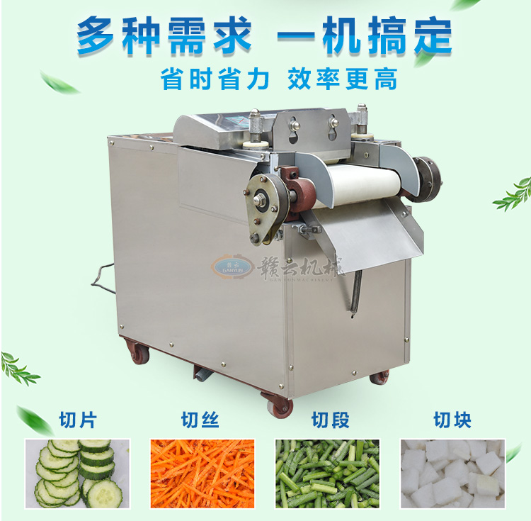 贛云牌多功能切菜機是根據(jù)多種樣機在實地使用中存在不足之處,反復(fù)改進設(shè)計制造,采用不銹鋼和全滾動軸承結(jié)構(gòu),具有外形美觀,成熟可靠,使用維修方便等特點。適用直蔬菜脫水、速凍、保鮮、腌漬等食品行業(yè)各類蔬菜。刀片距離可調(diào)節(jié)在0.1cm-2cm之間即切片、丁、絲厚薄在0.1cm-2cm。
