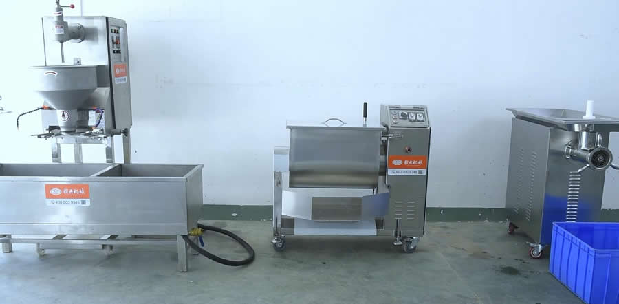 這一整套設(shè)備包含有:絞肉機、拌餡機、獅子頭肉丸成型機、智能溫控雙加熱水槽,這4臺設(shè)備組合可達到日產(chǎn)1噸肉丸,接下看看由贛云機械操作的機器全過程。