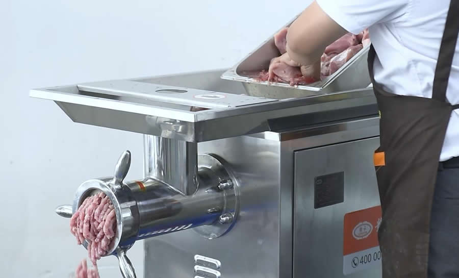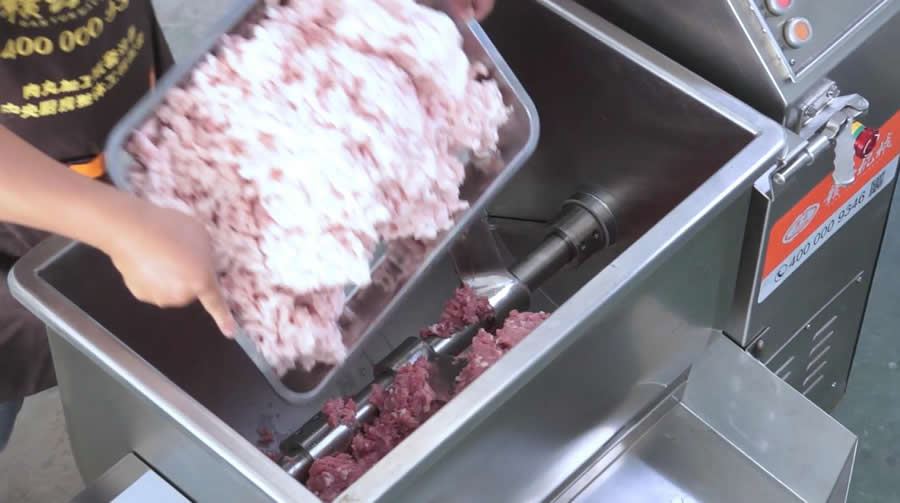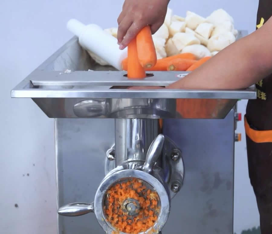 首先將所有原料準(zhǔn)備好,原料有:鮮豬肉(比例為:瘦6肥4)、胡蘿卜、生姜、小蒜、馬蹄、淀粉、冰水等。第一步是需要將原料通過絞肉機絞碎,這一步是使用贛云42型不銹鋼絞肉機,這臺機器可以用于鮮肉、微凍肉類、蔬菜等絞碎,機器動力強勁,絞肉速度快,每小時可達600公斤。