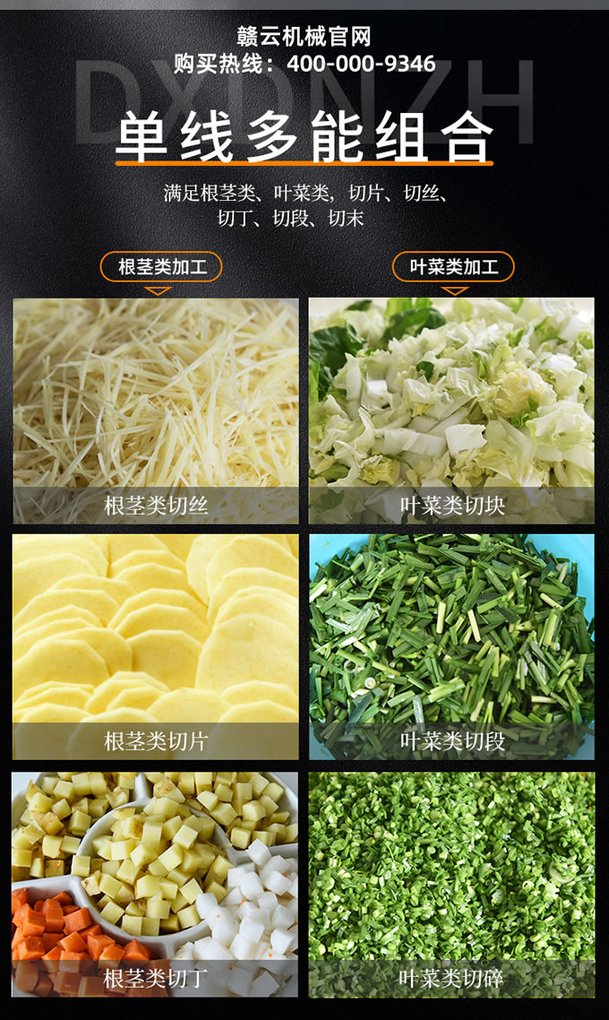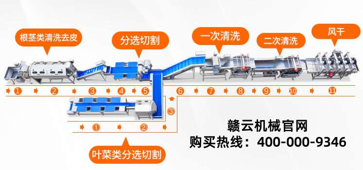 組成這條雙用凈菜加工流水線的主要設(shè)備包含:提升機、毛滾去皮清洗機、分選機、312切菜機(切片切絲切丁機)、六工位分選機、智能切菜機、輸送提升機、清洗提升機、一次渦流清洗機、一次震動過濾機、二次渦流清洗機、二次震動過濾機、震動風干機等設(shè)備組成。