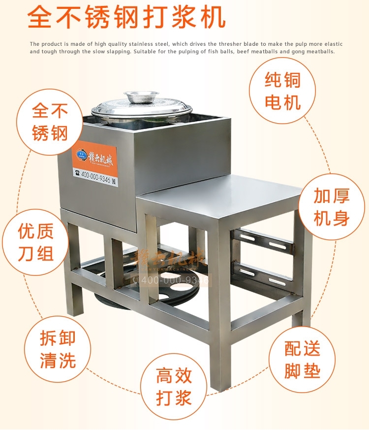 這臺(tái)慢速打漿機(jī)通過(guò)大皮帶輪減速帶動(dòng)打漿機(jī)刀片打漿,這樣通過(guò)慢速拍打,可以使拍打過(guò)程中能對(duì)肉類組織細(xì)胞拉絲重組,加大吸收水分,提高肉類的嫩化程度,讓打出來(lái)的肉漿制成丸子后更軟彈有嚼勁。適合魚(yú)丸、牛肉丸和貢丸的制漿之用。