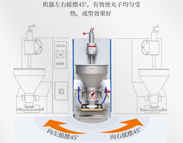 搖擺成型:搖擺肉丸機(jī)通過(guò)合理布局,將設(shè)備上半部分設(shè)計(jì)通過(guò)齒輪軸承傳動(dòng)可以進(jìn)行左右各45°的自動(dòng)轉(zhuǎn)動(dòng),在邊轉(zhuǎn)動(dòng),同時(shí)邊快速成型肉丸,這樣讓成型后的肉丸下落位置不同,大大減少了肉丸堆積粘連一起的現(xiàn)象。