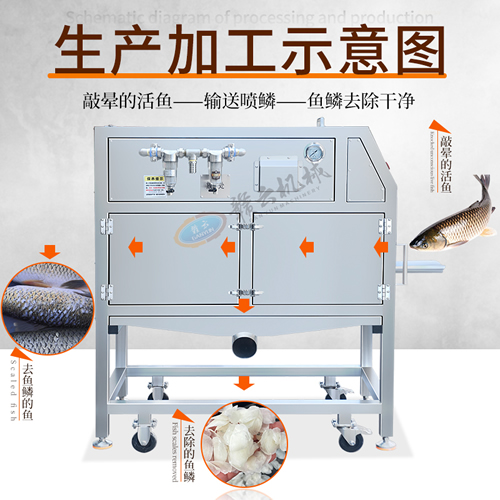 經過暫養(yǎng)后的鮮魚在進入去麟這一環(huán)節(jié)需要用到這款高壓去魚麟設備,通過高壓水噴射的方法去除魚鱗,以達到不損傷魚頭和魚身,保障了食材的完整度。這臺設備操作簡單,去麟干凈,且對魚體損傷小。