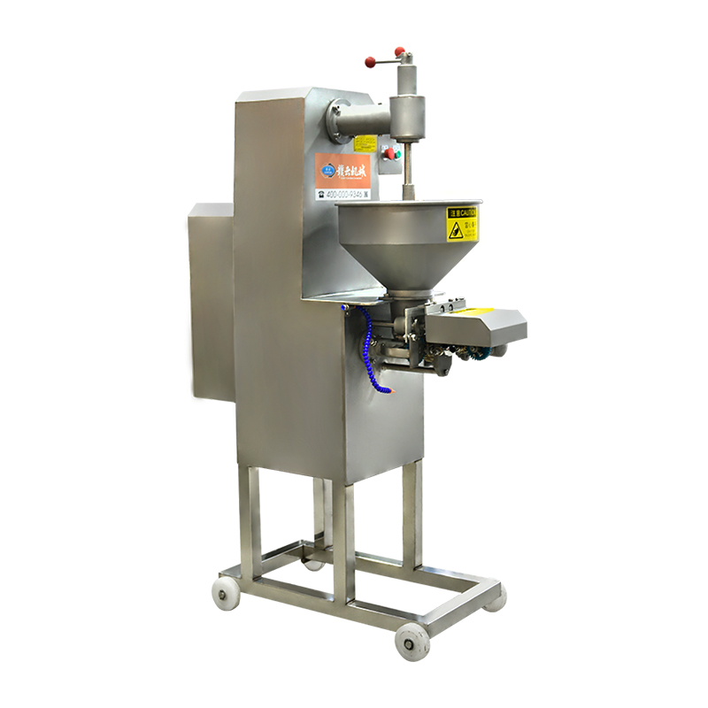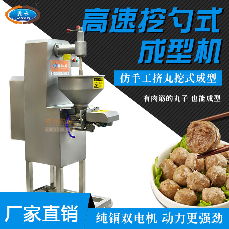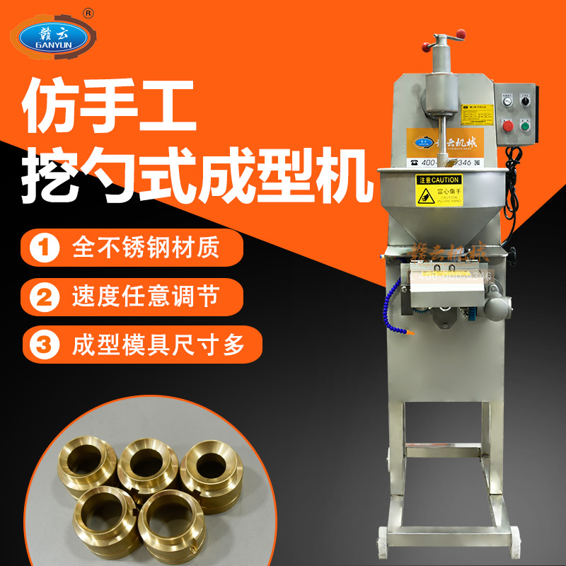 全自動仿手工擠丸挖式成型機,又稱墨魚丸成型機或高速貢丸成型機,是一款完全仿手工用匙子成型的設(shè)備。不同于普通成型機的刀片切割,用開明型鋼勺自動舀挖出丸子,做出丸子具有彈性好,圓度好、外表皮光滑或保持原漿體顆粒,還可以拔層的特點,。特別在做貢丸和牛肉丸這些有肉筋的丸子的時更能顯示其顯著的性能。
